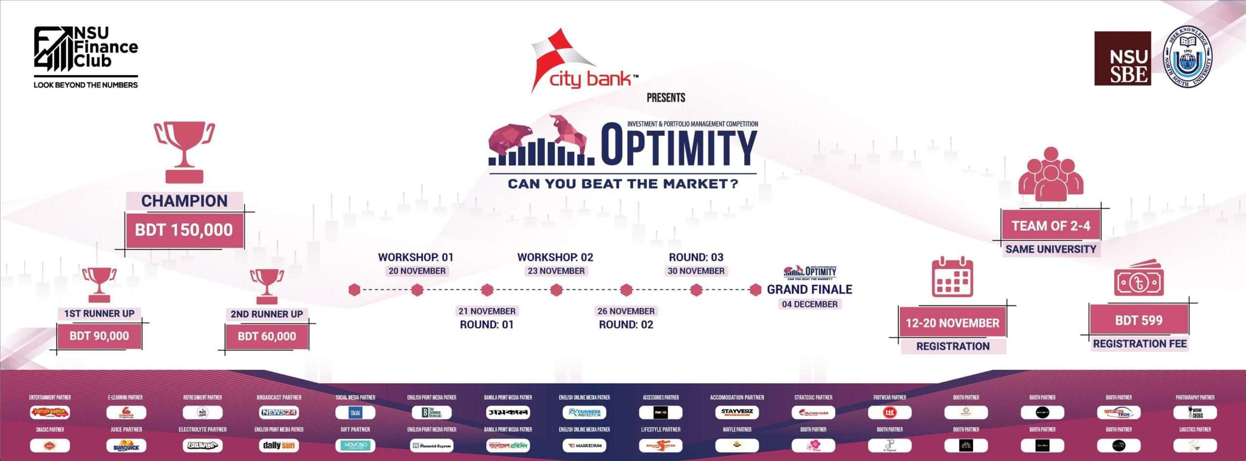 North South University Finance Club is proud to announce Optimity 2024, the nation’s largest investment and portfolio management competition, presented by The City Bank. This prestigious event invites undergraduate students from all academic disciplines across Bangladesh to showcase their financial acumen and unlock new career opportunities.
